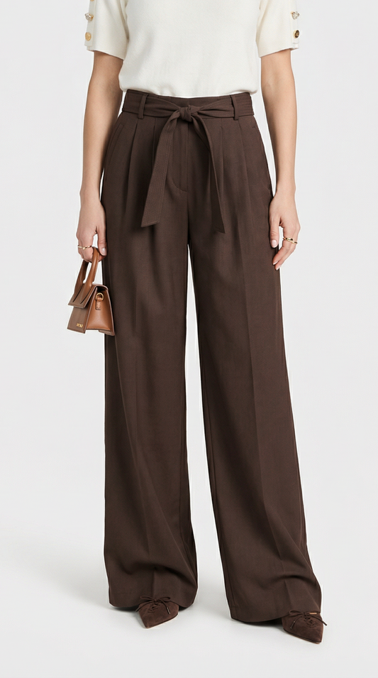 • Brown Tie-Strap Pleated Wide-Leg Trousers